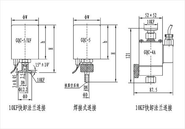 GQC-1.5 GQC-5型電磁高真空充氣閥是以電磁力為動(dòng)力,當(dāng)接通電源時(shí),閥門被關(guān)閉,使真空系統(tǒng)與大氣隔離;切斷電源時(shí),閥門處于開啟狀態(tài),隨之大氣由外界引入真空系統(tǒng)。GQC-4A型電磁高真空充氣閥具有通電開啟和通電關(guān)閉兩種功能,閥內(nèi)帶有空氣過濾器,可用作向真空系統(tǒng)充氣。